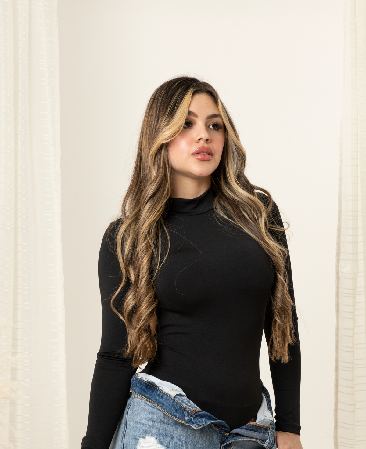 Body en manga larga y cuello alto, básico y esencial en cualquier armario. Con un diseño ajustado que realza la figura y con espalda descubierta.